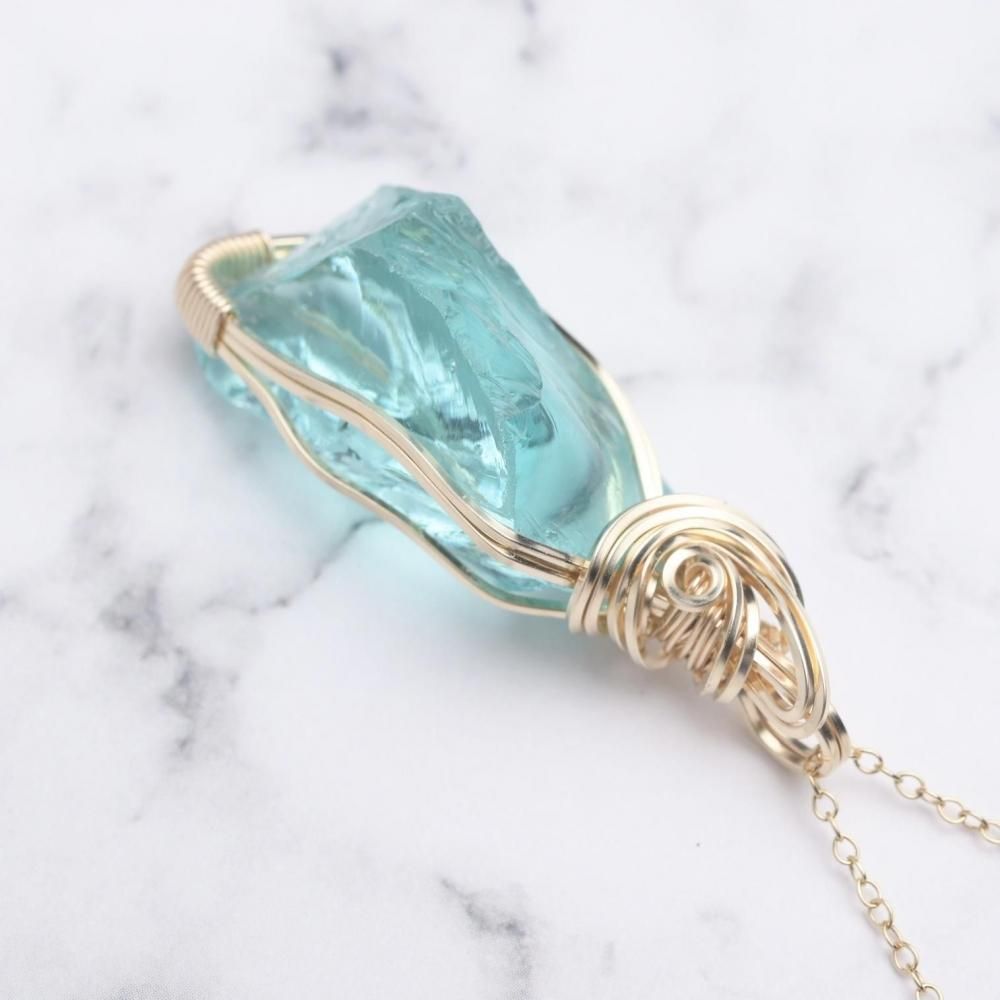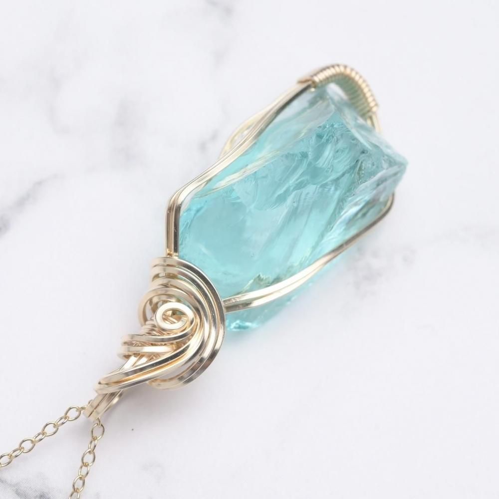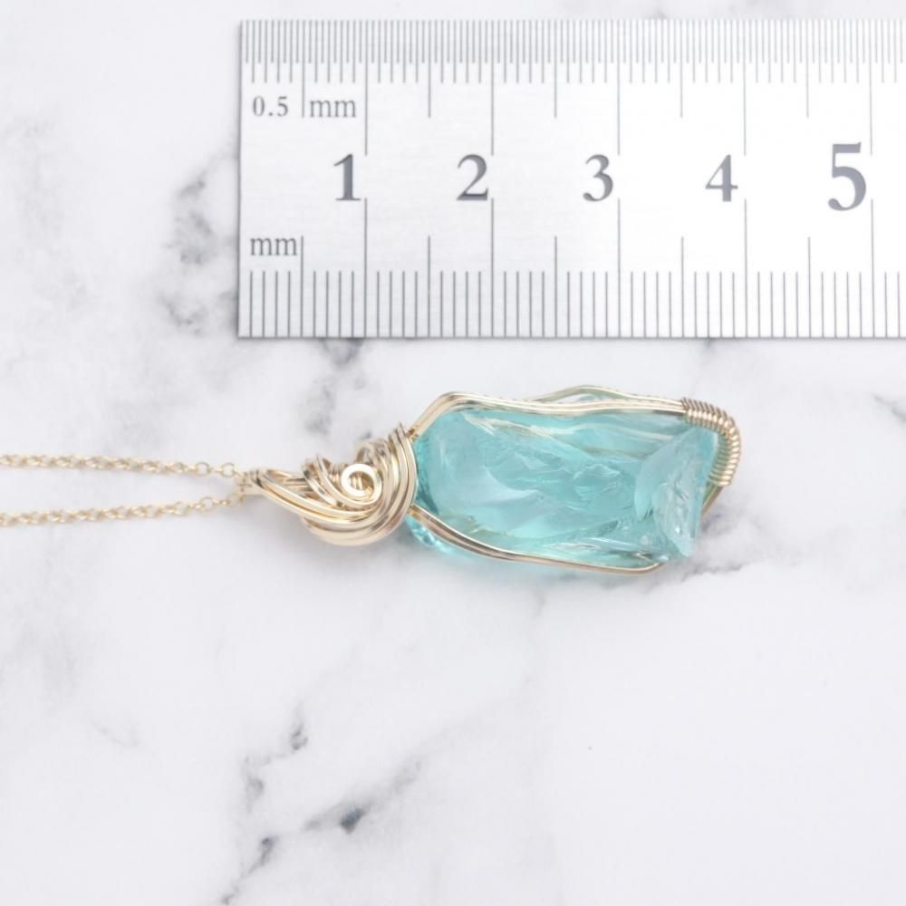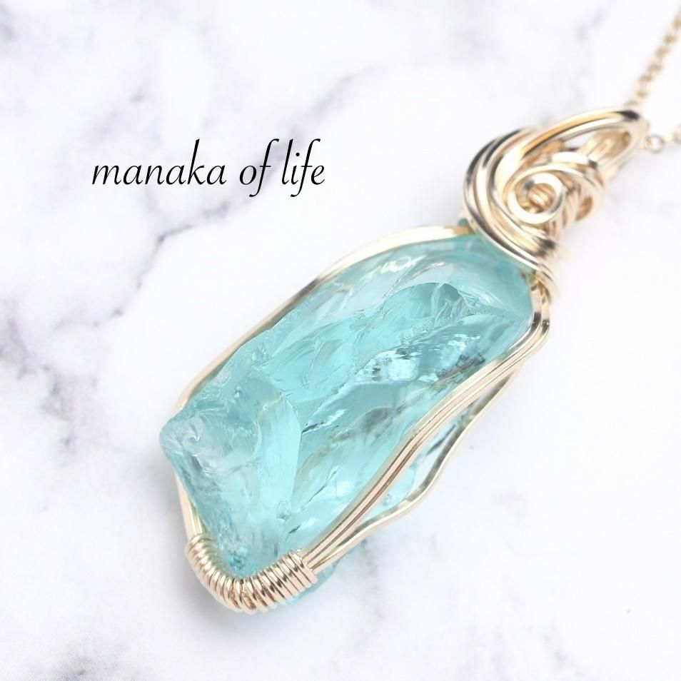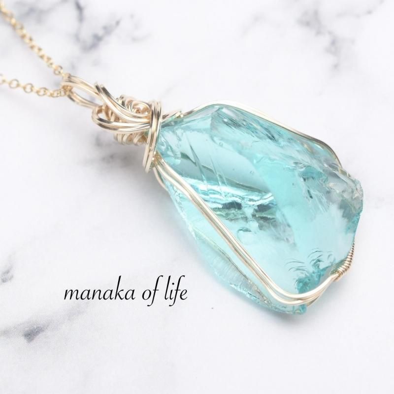 ワイヤーワークと、アンダラクリスタルならではの鮮やかなライトブルー、表面形状が光を受けてキラキラと輝きます。