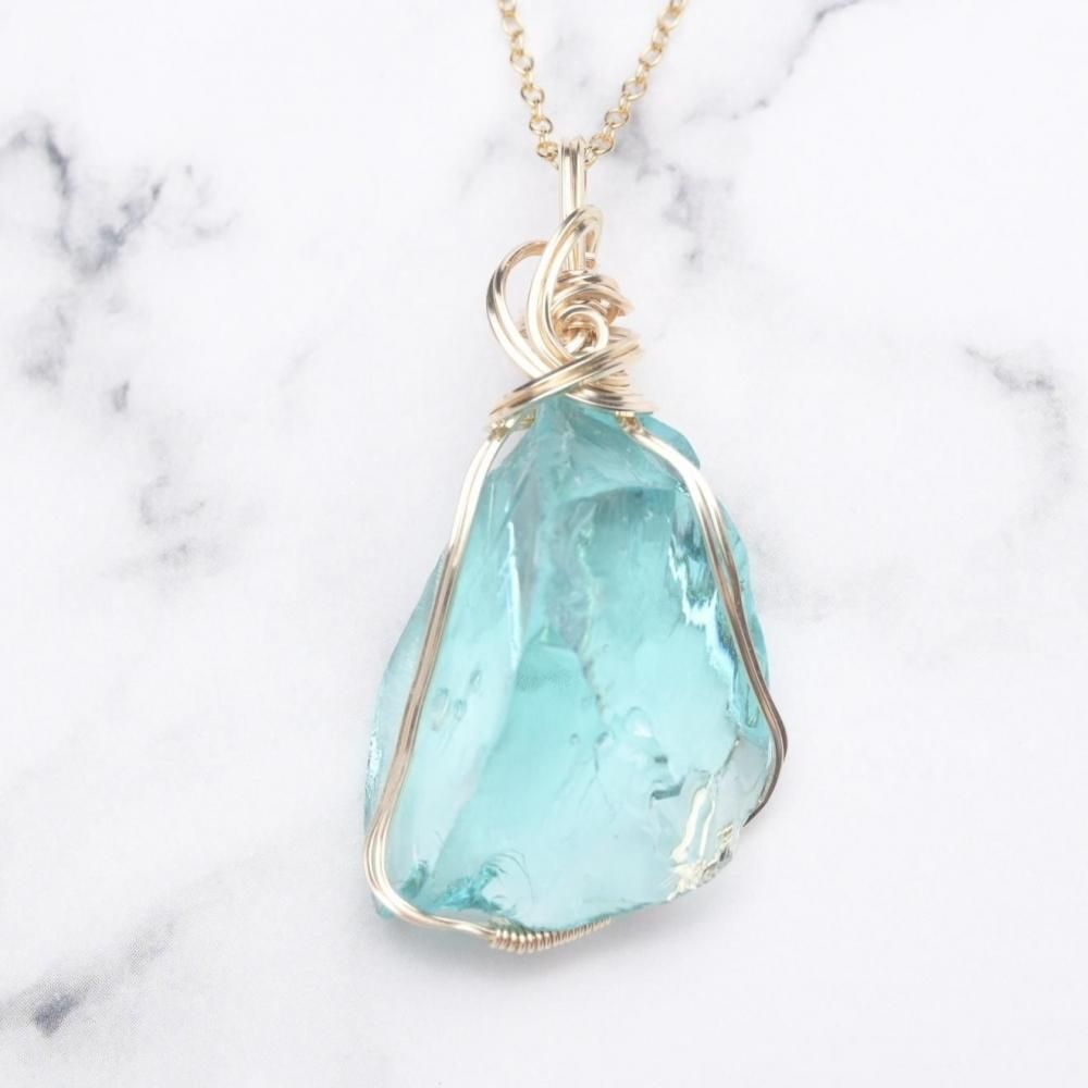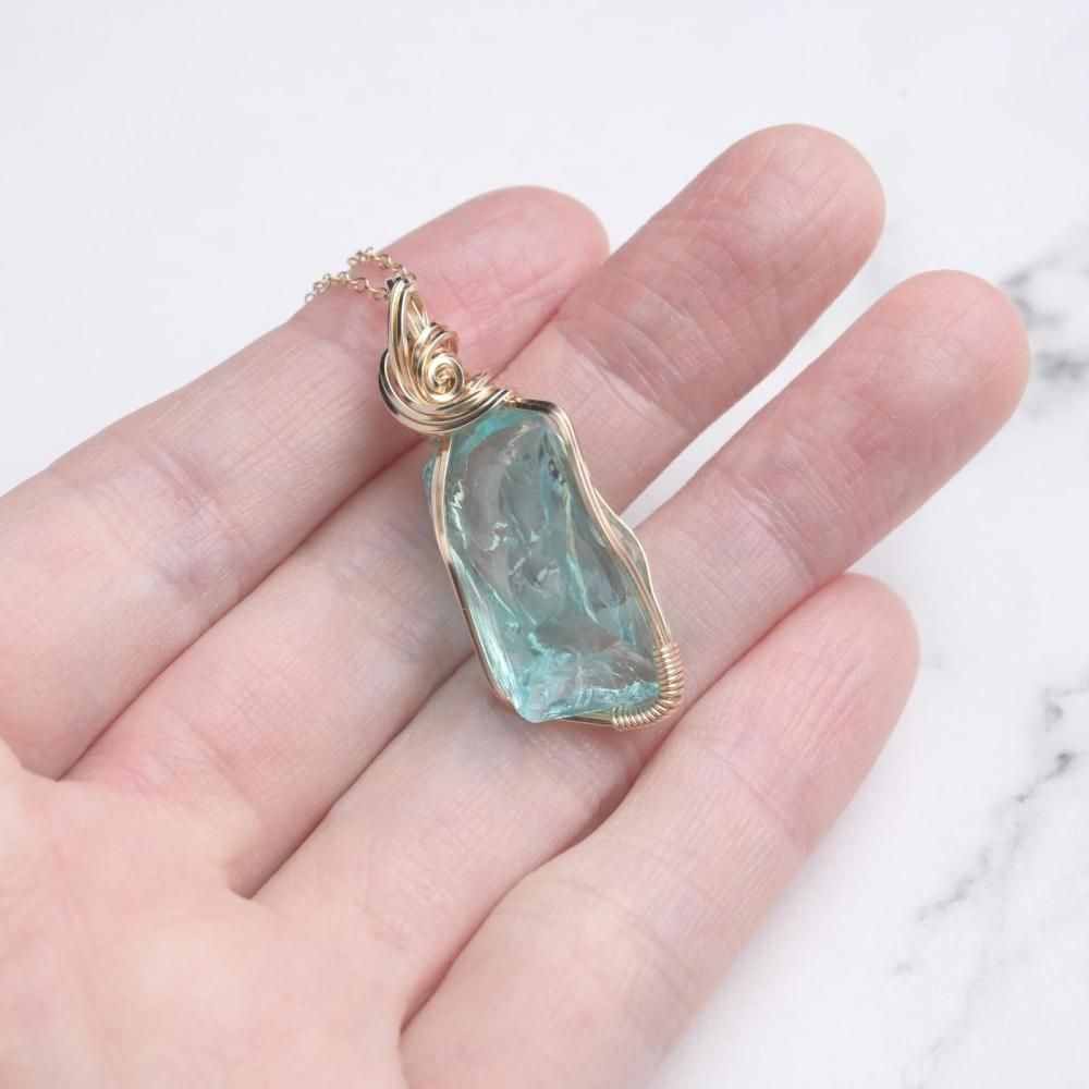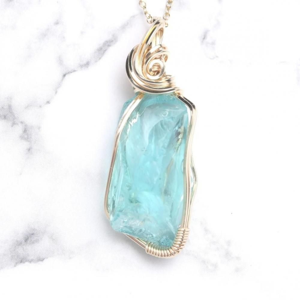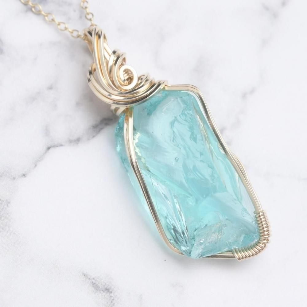 ワイヤーワークと、アンダラクリスタルならではの鮮やかなライトブルー、表面形状が光を受けてキラキラと輝きます。