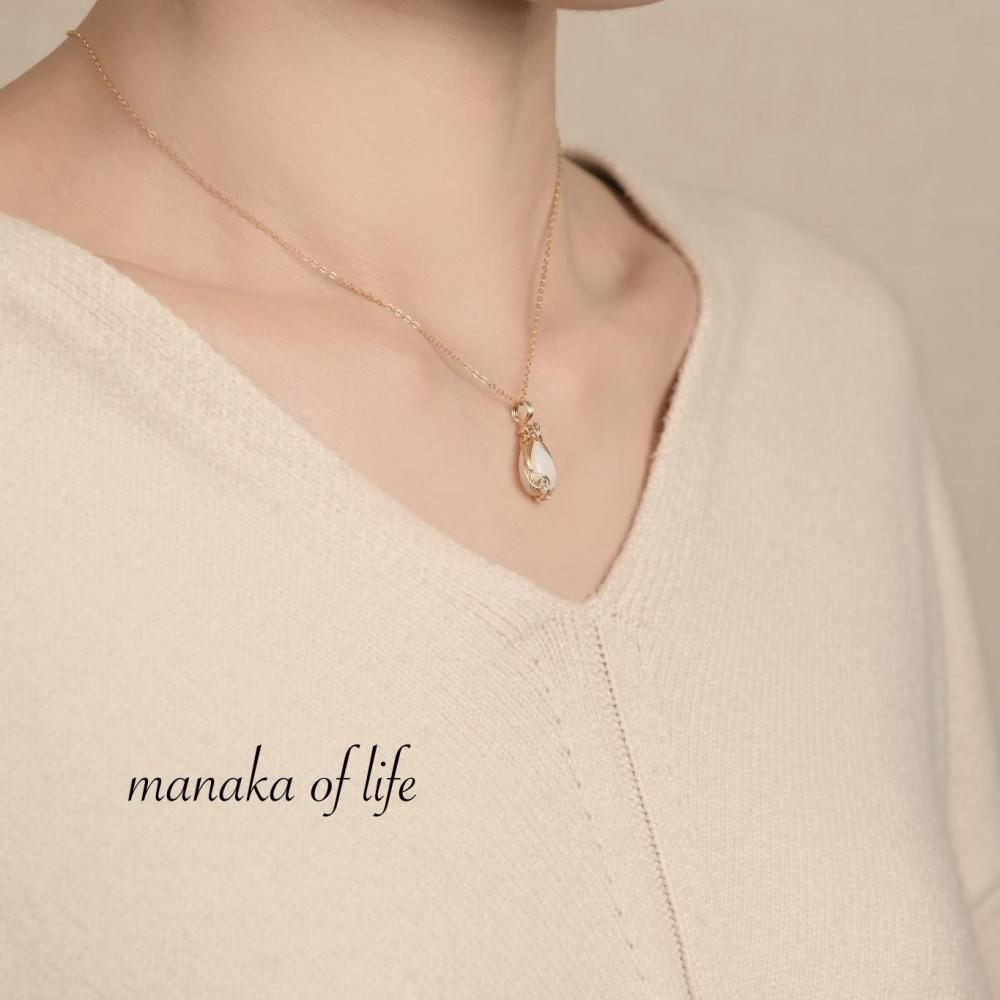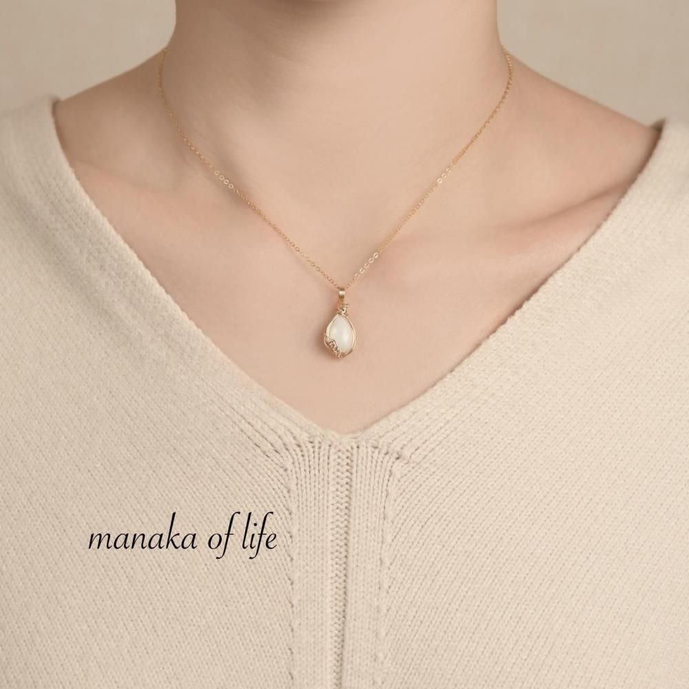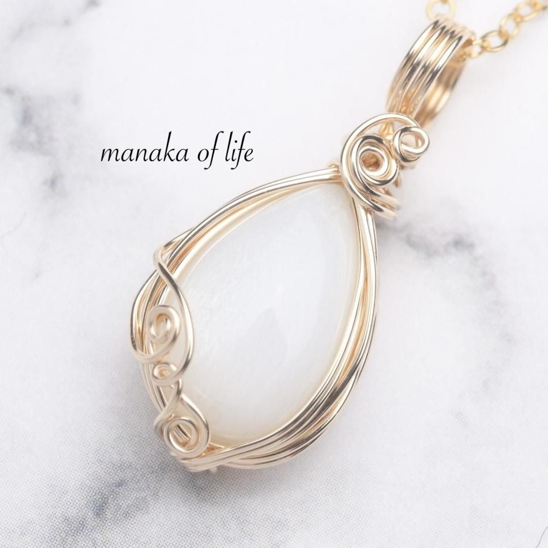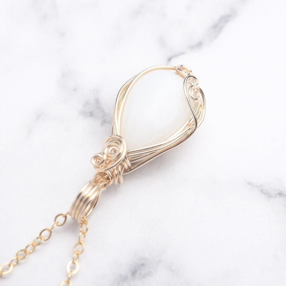 艶感のあるミルキーカラーのムーンストーンと、14kgfワイヤーの装飾で華やかな雰囲気に仕上がりました。