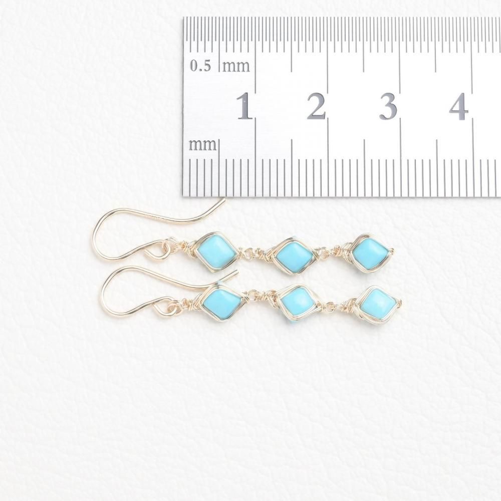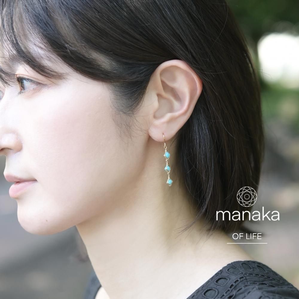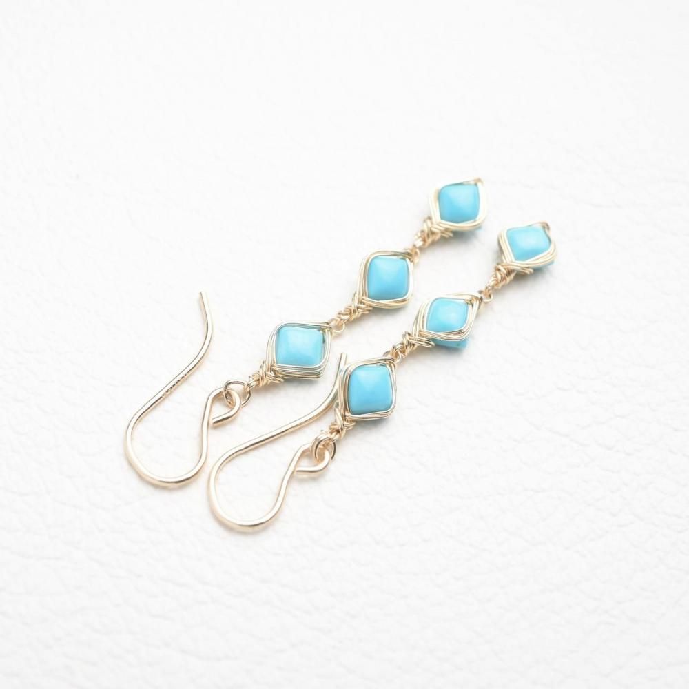 スクエアファセットカットのキングマンターコイズを、繊細にワイヤーラッピングし、揺れる3連のピアスに仕立てました。