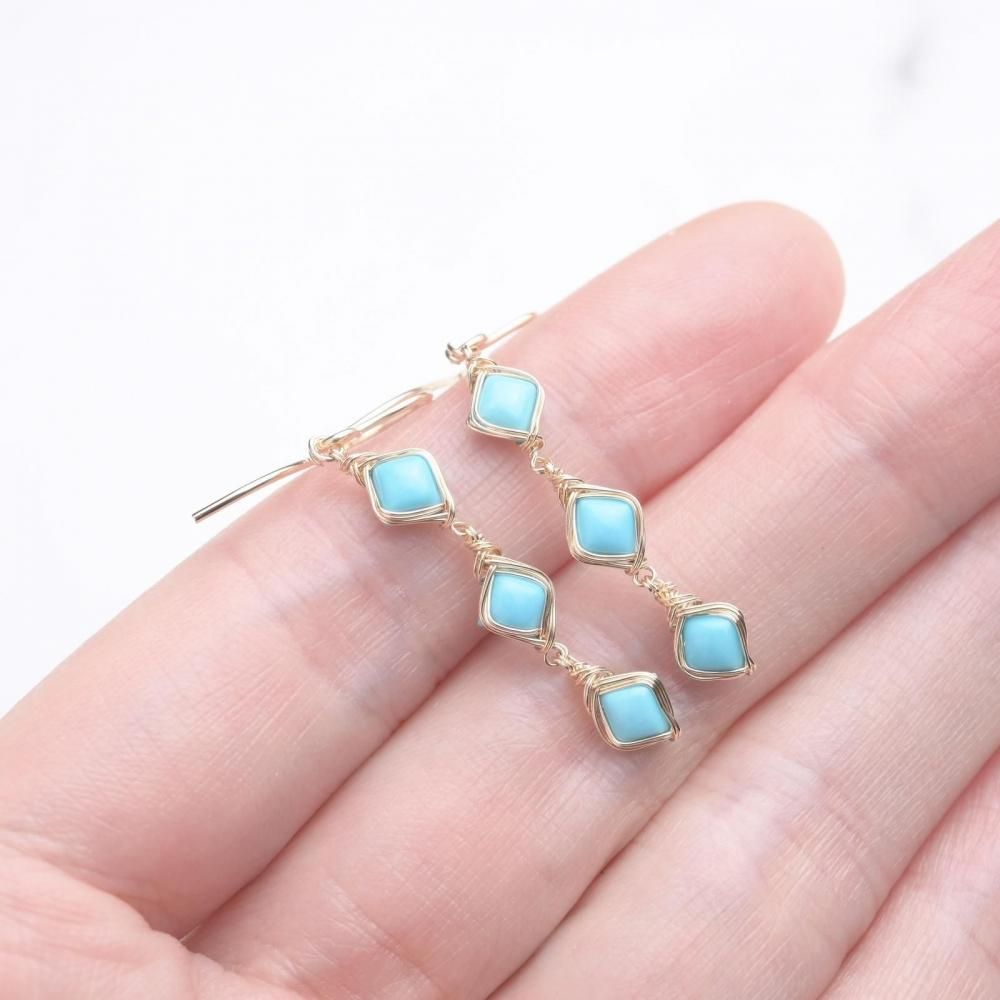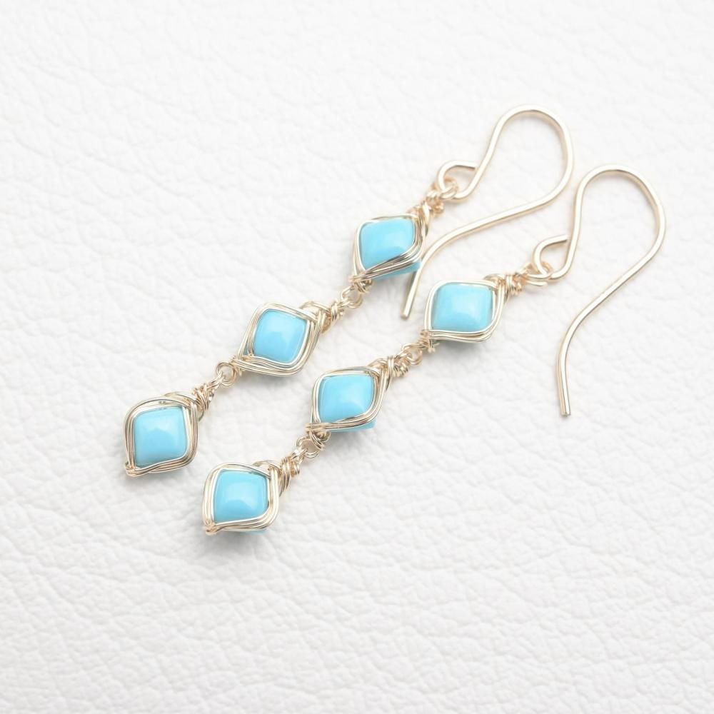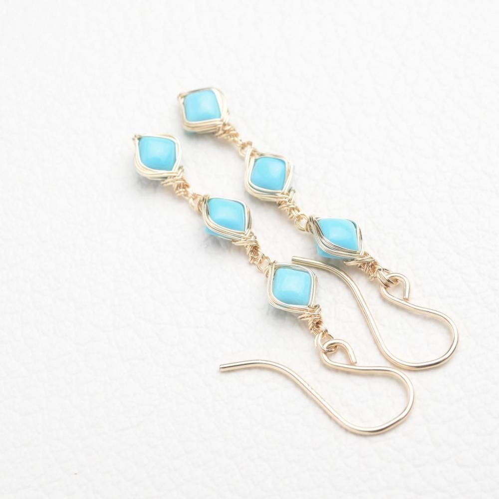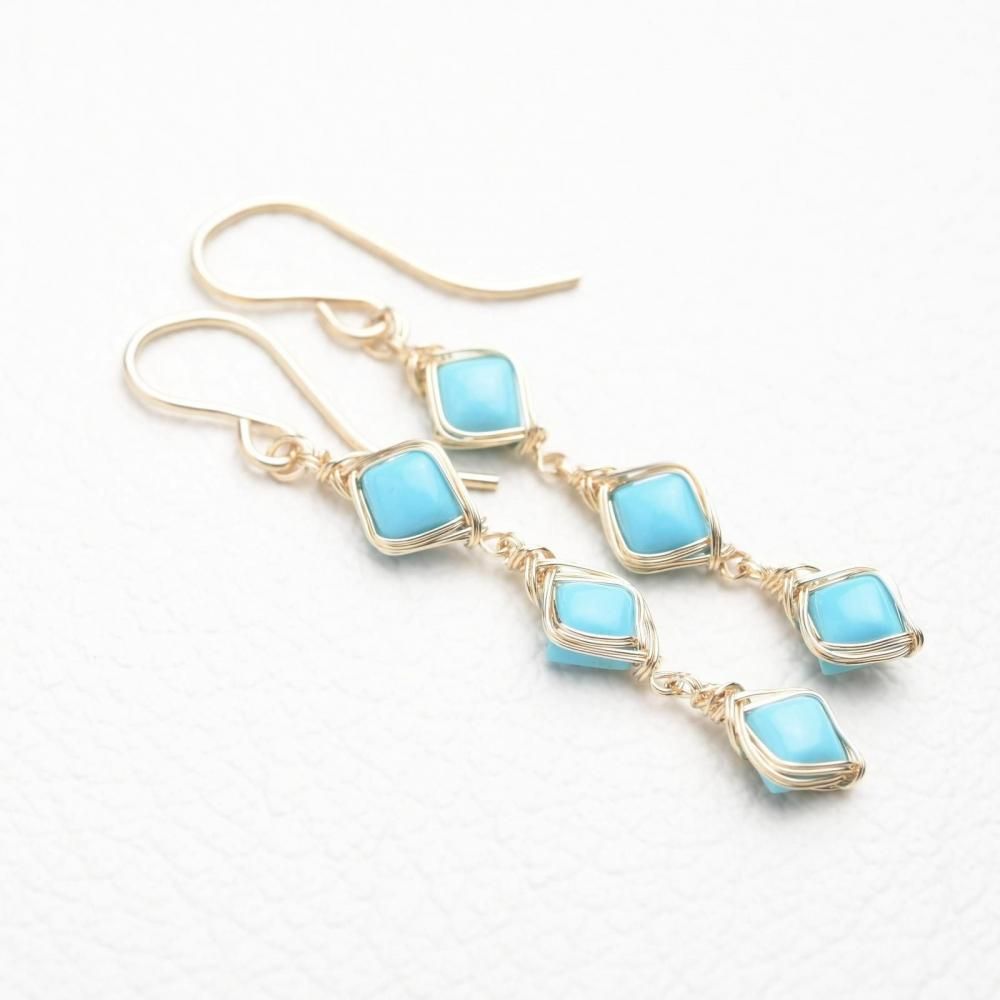 スクエアファセットカットのキングマンターコイズを、繊細にワイヤーラッピングし、揺れる3連のピアスに仕立てました。
