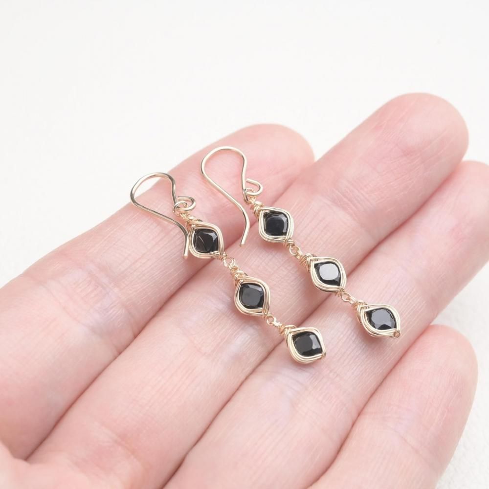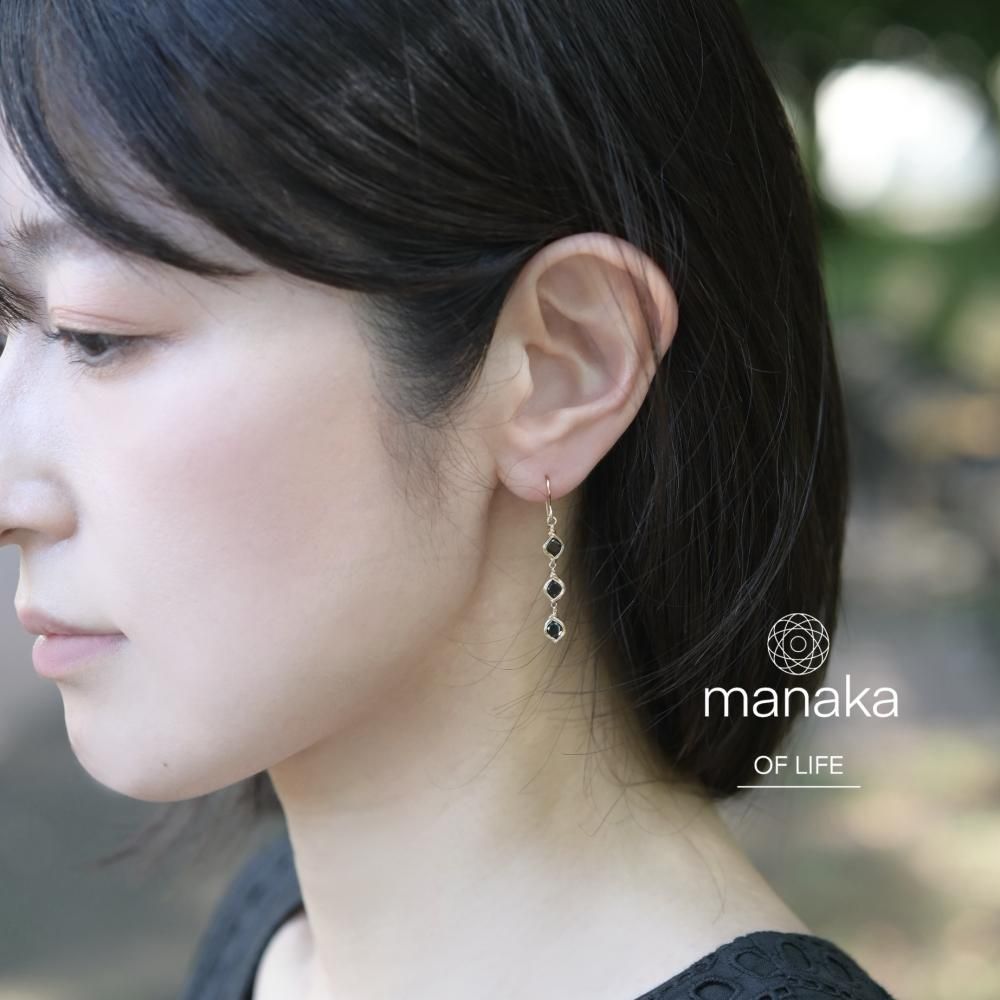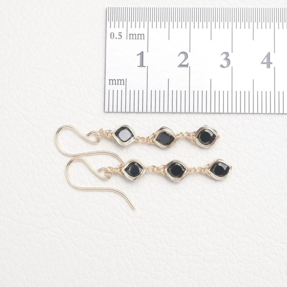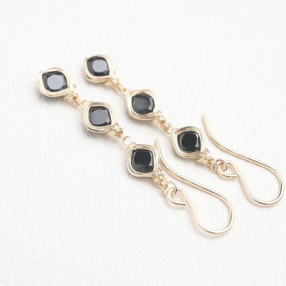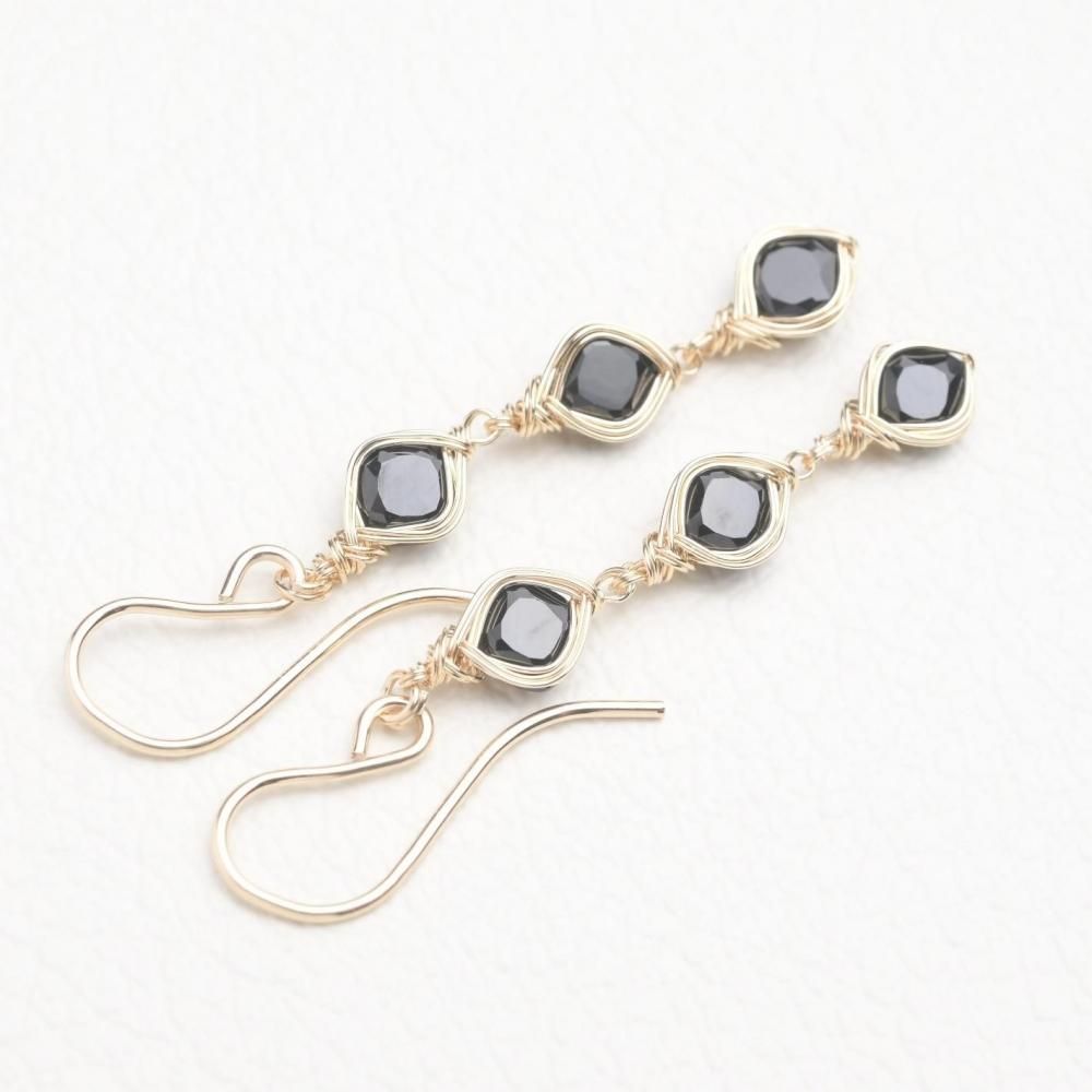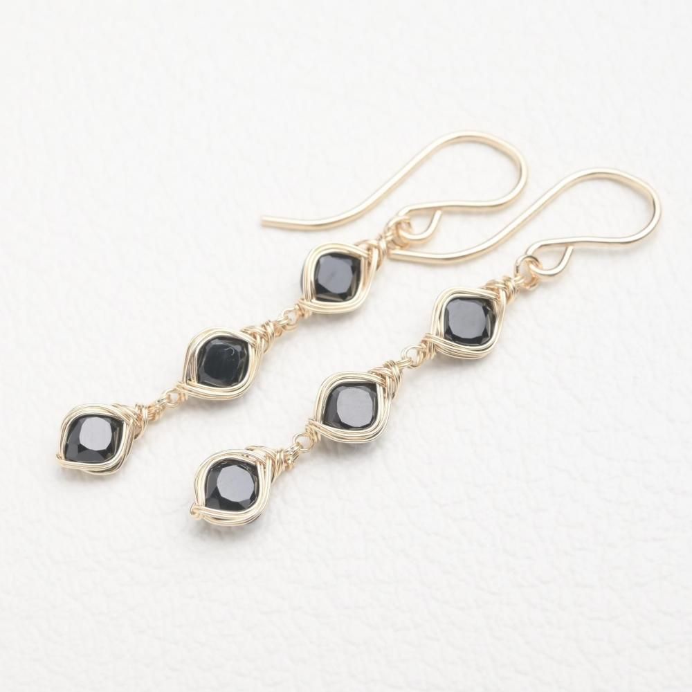 スクエアファセットカットのブラックスピネルを、繊細にワイヤーラッピングし、揺れる3連のピアスに仕立てました。