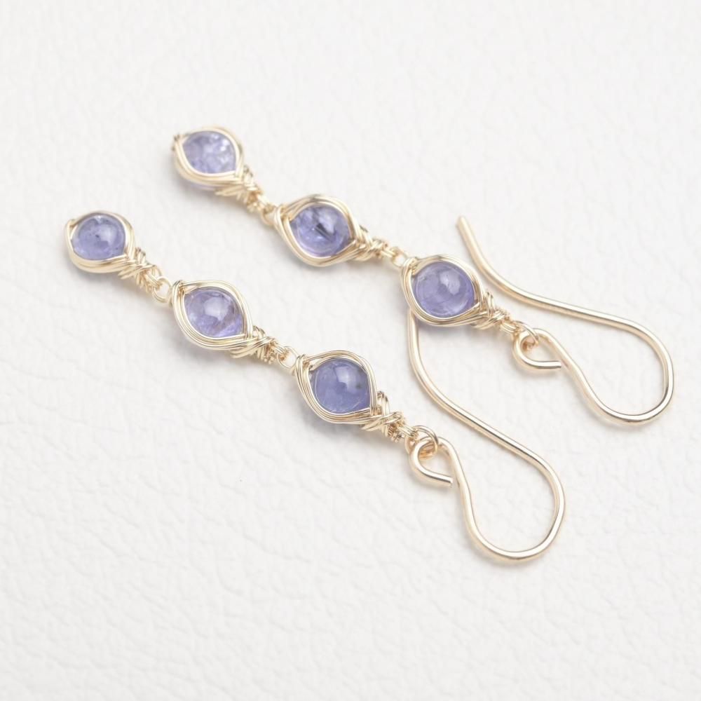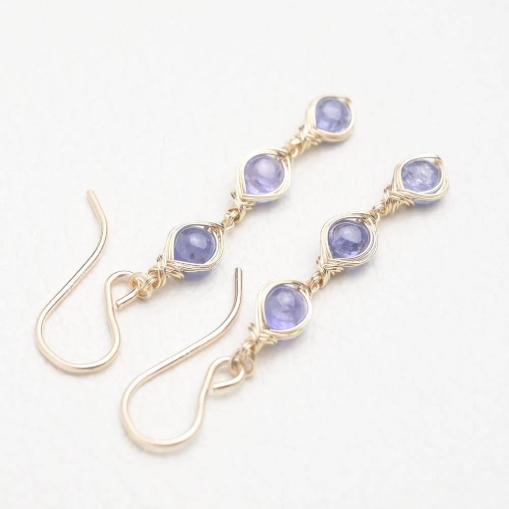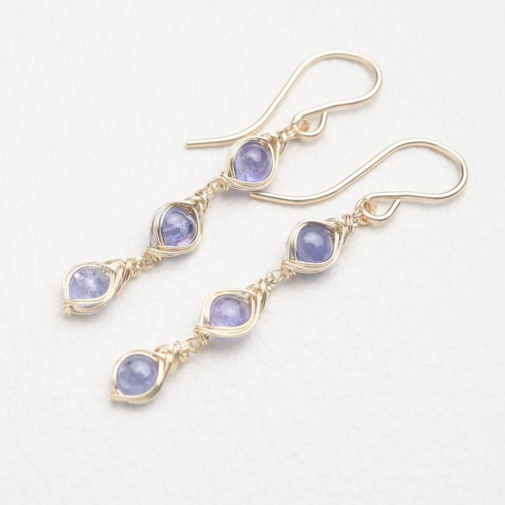 ラウンド型のタンザナイトを繊細にワイヤーラッピングし、揺れる3連のピアスに仕立てました。