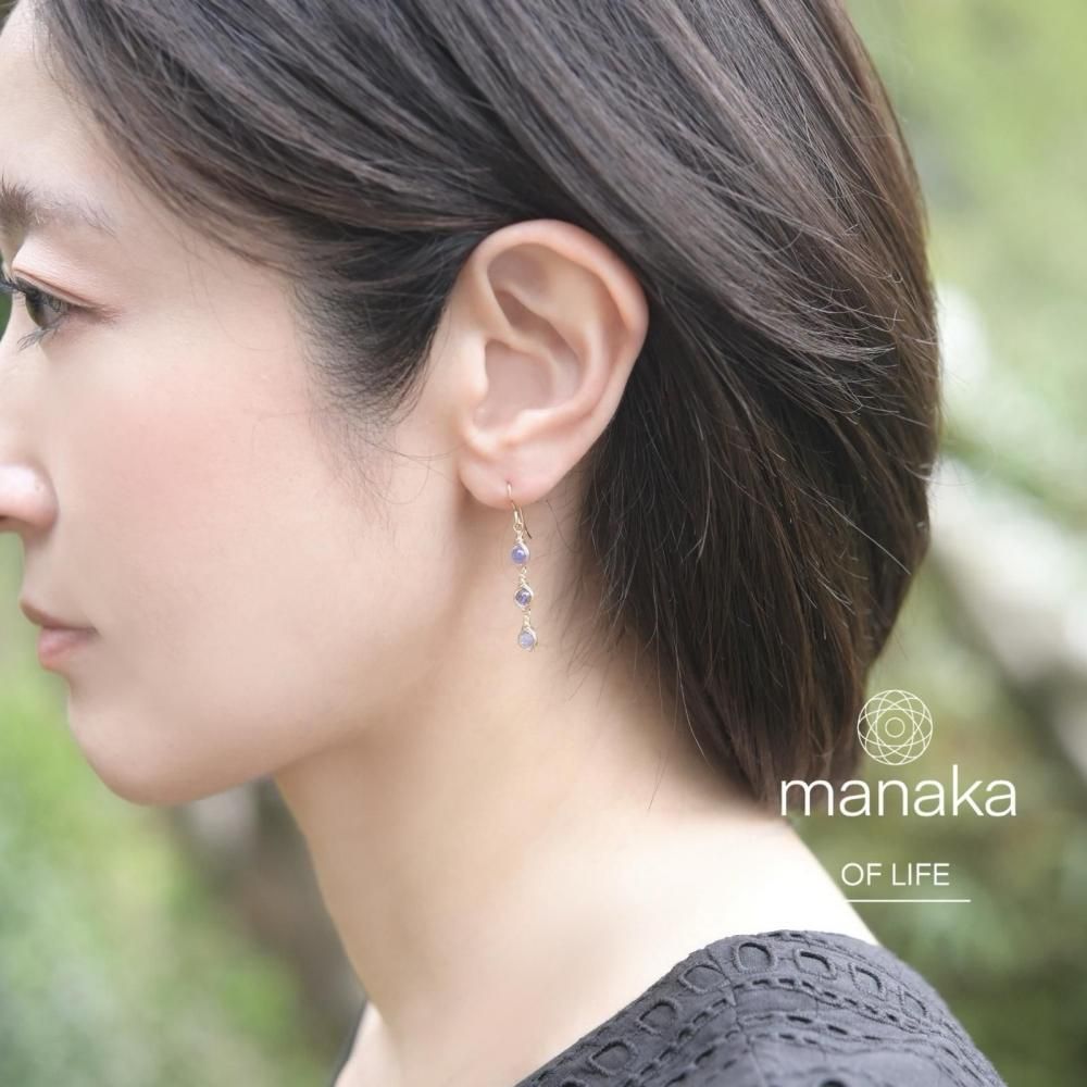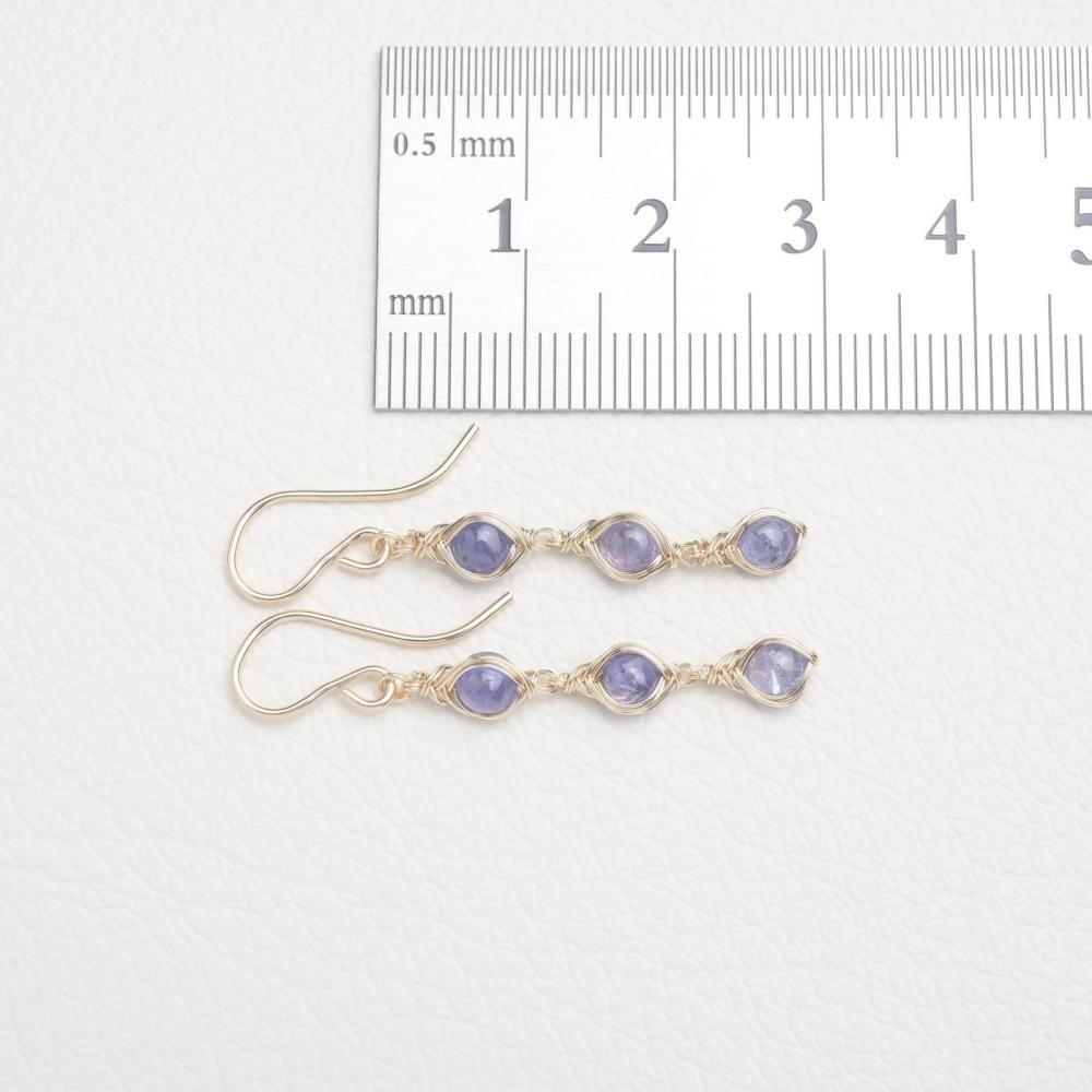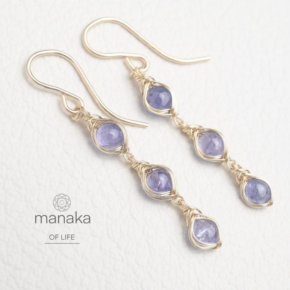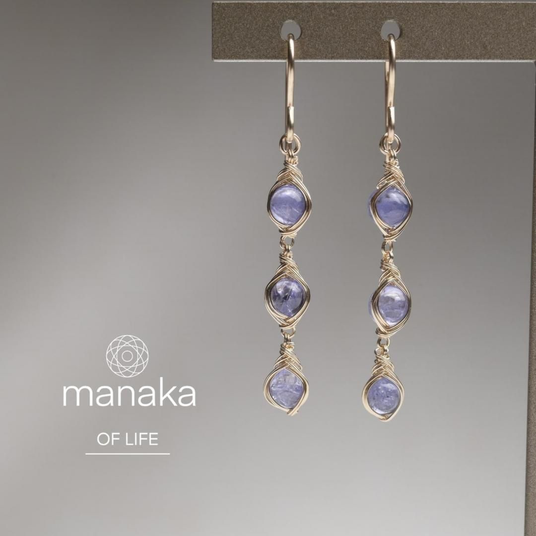 ラウンド型のタンザナイトを繊細にワイヤーラッピングし、揺れる3連のピアスに仕立てました。