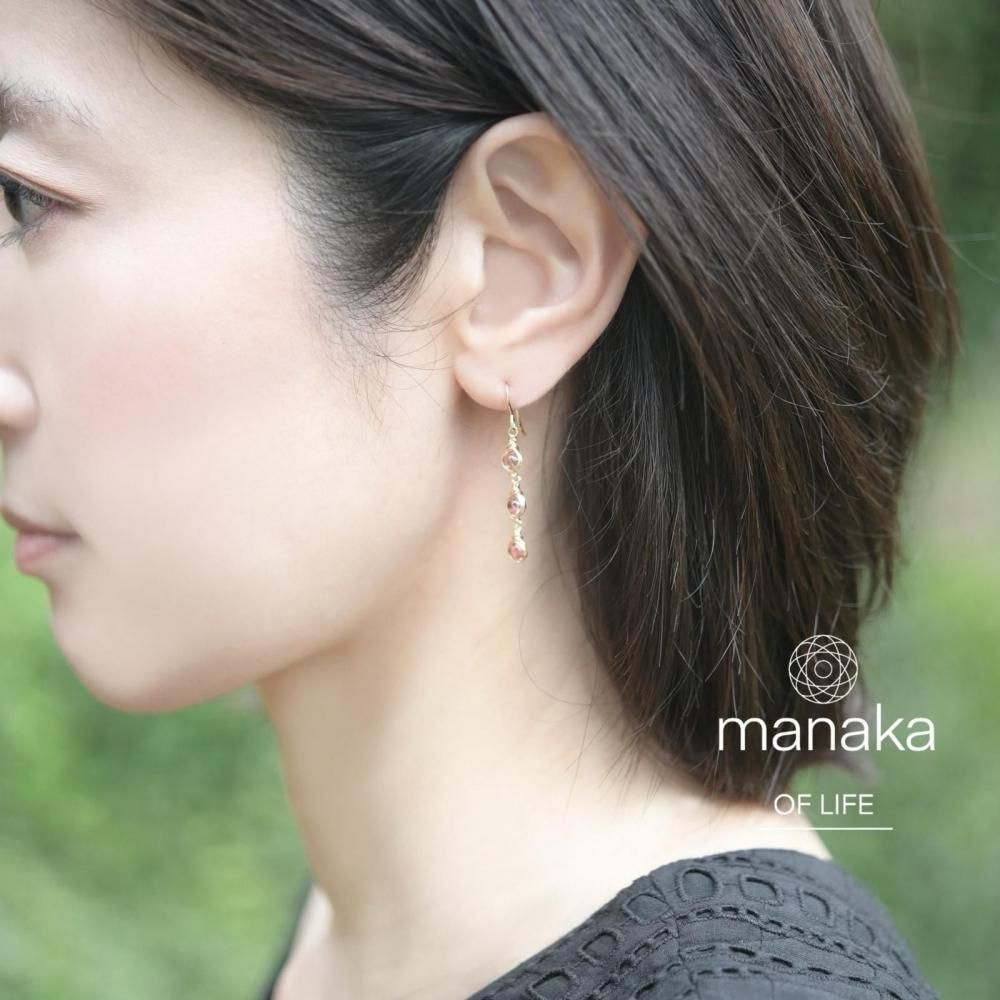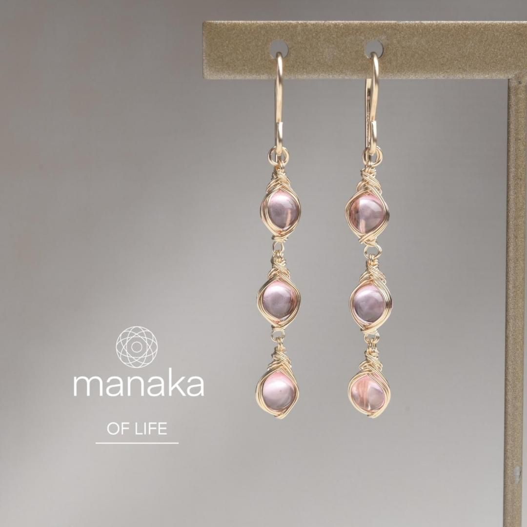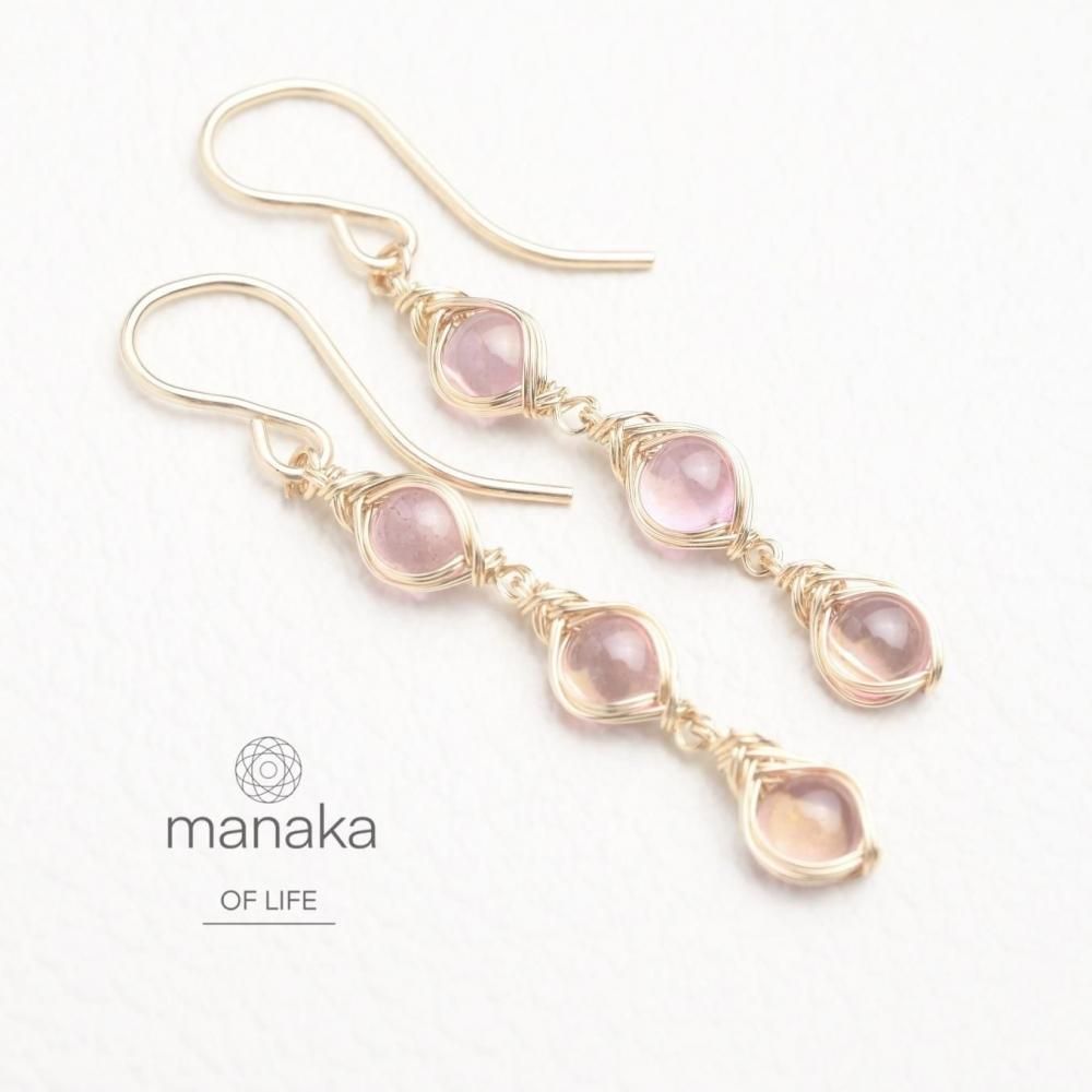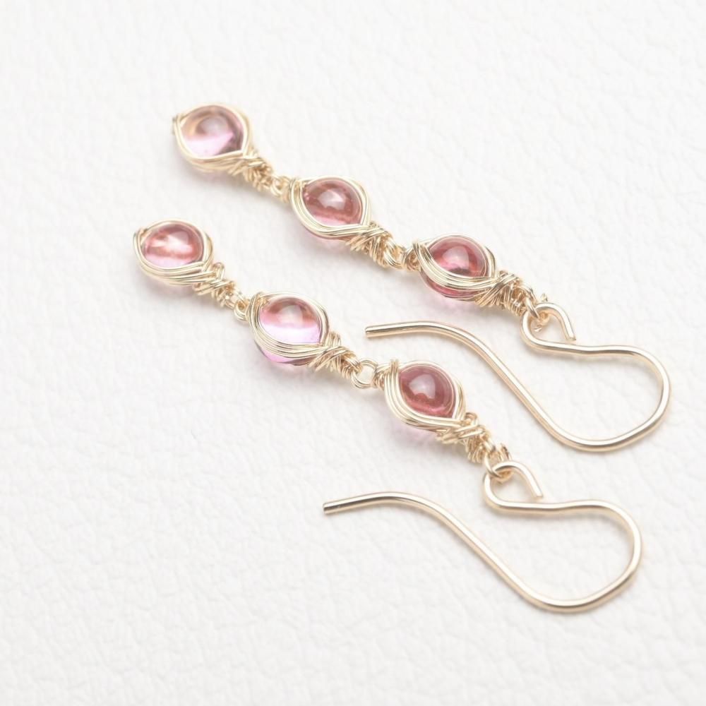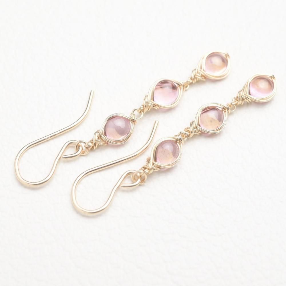 ラウンド型のピンクトパーズを繊細にワイヤーラッピングし、揺れる3連のピアスに仕立てました。