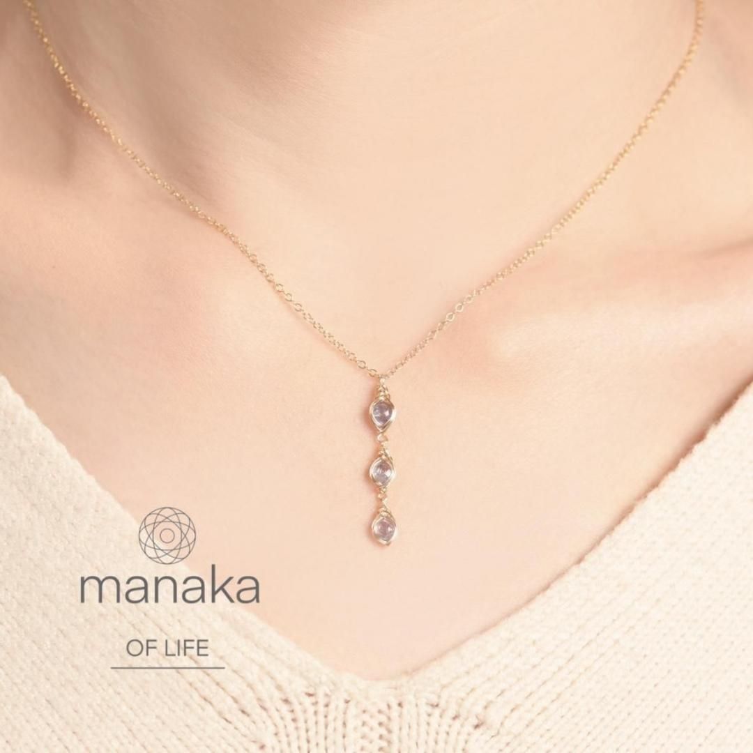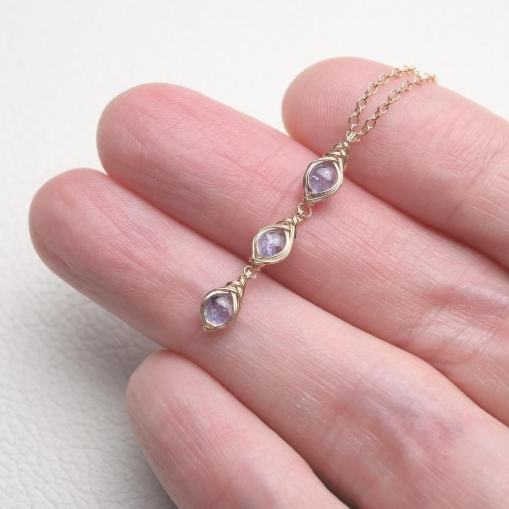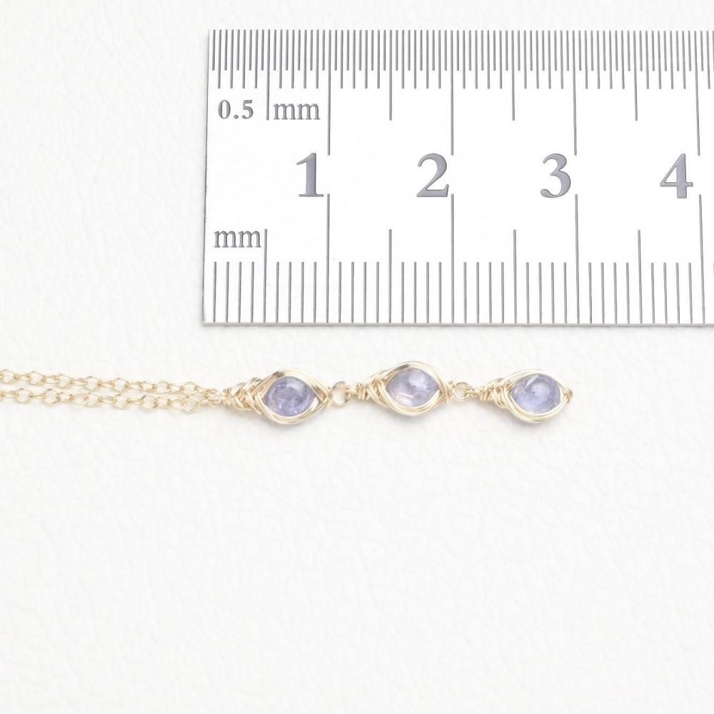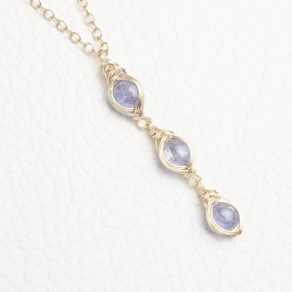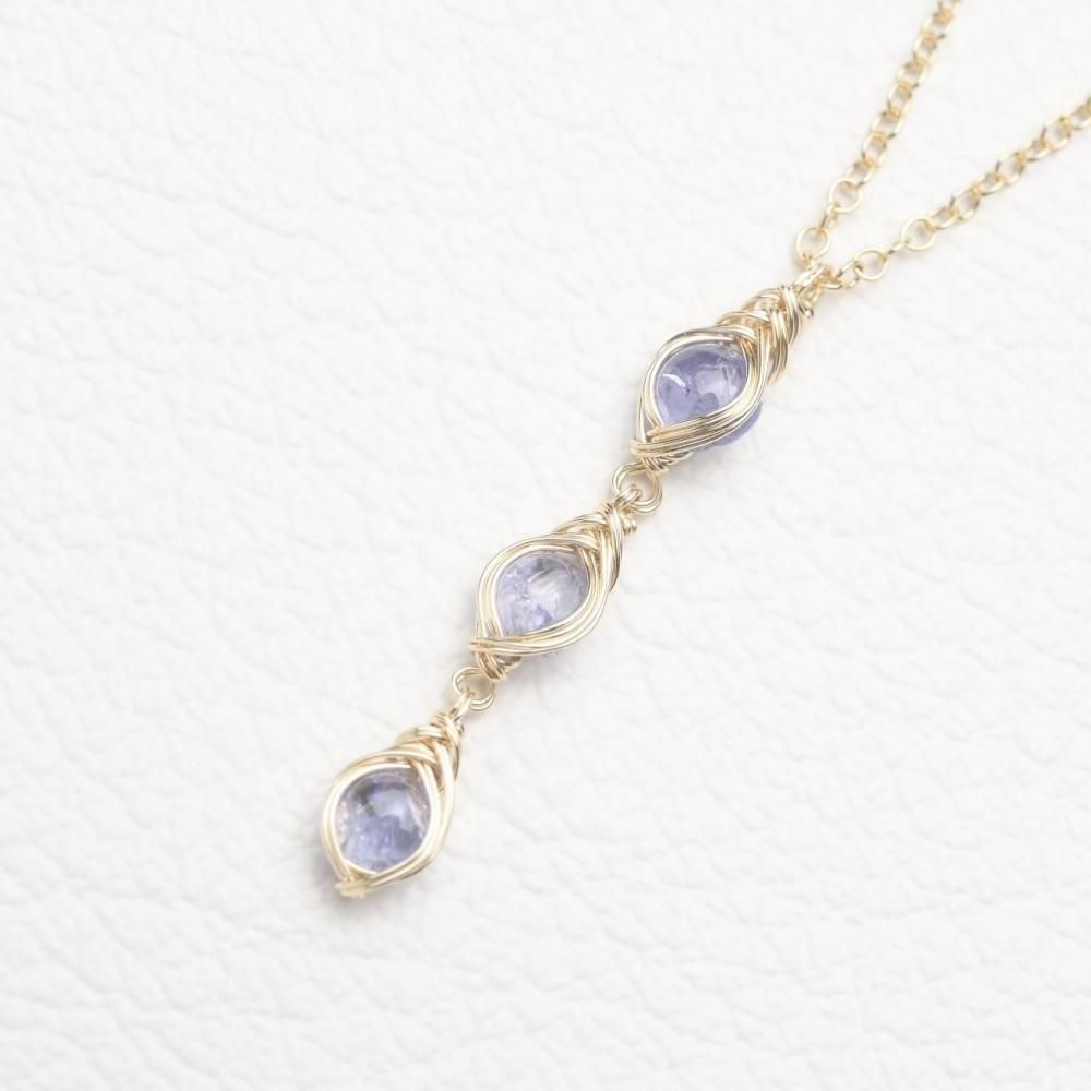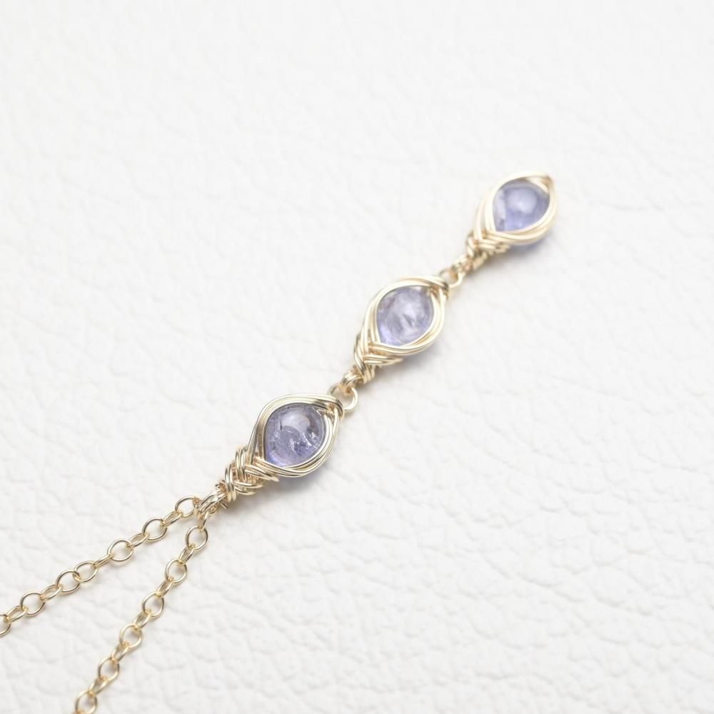 極小ラウンドのタンザナイトを繊細にワイヤーラッピングし、揺れる3連のネックレスに仕立てました。